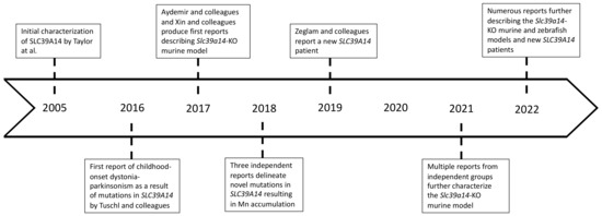 Since 2016, an increasing number of clinical reports have described a progressive childhood-onset dystonia-parkinsonism resulting from inherited, autosomal recessive, loss-of-function mutations of the SLC39A14 gene [6,22,23,24,25,26,27,28,29,30]. The timeline of most recent and significant discoveries can be found in Figure 2. SLC39A14 encodes for a metal ion influx transporter of the same name. Originally, SLC39A14 was studied as a zinc (Zn) transporter; however, most recent studies and clinical cases indicate a major role in Mn transport and homeostasis [6,22,23,24,25,26,27,28,29,30]. In addition to Mn and Zn transport, SLC39A14 can also transport iron (Fe) and cadmium. In vitro studies have shown that when the SLC39A14 mutations occur, although the protein is localized in the appropriate subcellular compartment—the plasma membrane—it is unable to effectively transport Mn. SLC39A14 is primarily expressed in the hepatocytes and is central to hepatic regulation of Mn homeostasis [6,32]. Therefore, individuals that express the mutated protein accumulate toxic levels of Mn in the blood and the brain due to the inability of hepatocytes to absorb Mn from the peripheral circulation.