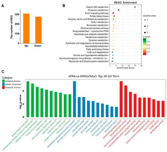 Transcriptome analysis of C. gigas after ATRA treatment. (A) Numbers of differentially expressed genes (DEGs) in C. gigas after all-trans retinoic acid (ATRA) treatment. Fold change ≥ 2, p values < 0.05. (B) KEGG pathways enriched for the ATRA-regulated genes. p values < 0.05. (C) GO enrichment analysis of DEGs in ATRA-treated oysters. p values < 0.05.
