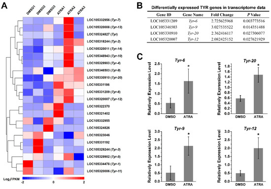 Expression of TYR gene after ATRA treatment. (A) The expression profiles of 22 TYR genes identified in transcriptome sequencing; (B) differentially expressed TYR genes in transcriptome data (fold change ≥ 2, p values < 0.05); (C) verification of TYR gene expression by RT-qPCR. Relative expression of TYR genes after ATRA treatment. Error bars represent means of three replicates ± SD (standard deviation, n = 6). (* p < 0.05; Student’s t test).