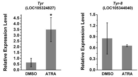 Tyr (LOC105324827) and Tyr-8 (Trp2, LOC105344040) are tyrosinase genes related to melanin production in C. gigas [36,37]. Thus, the relative expression of these two genes was investigated using RT-qPCR after ATRA treatment. As shown in Figure 3, the expression of Tyr was significantly upregulated by ATRA treatment, whereas there was no significant change in the expression of Tyr-8 after ATRA treatment. This suggests that the RA pathway may regulate expression of certain TYR genes in C. gigas.