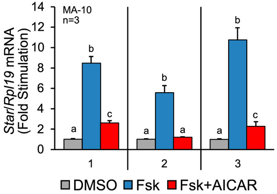 The MA-10 Leydig cells were cultured in the presence of either DMSO (vehicle), Fsk (10 µM), or Fsk+AICAR (10 µM + 1 mM) for 60 min. Isolation of RNA, cDNA synthesis, and reverse transcription-quantitative PCR (RT-qPCR) were performed as previously described [63,64]. Briefly, the total RNA from the MA-10 Leydig cells grown and treated, as described above, was isolated using TRIZOL (Life Technologies, Burlington, ON, Canada) and reverse-transcribed using the iScript Advanced cDNA Synthesis Kit (Bio-Rad Laboratories, ON, Canada). A quantitative real-time PCR was performed using a CFX96™ Real-Time PCR Detection System (Bio-Rad Laboratories, ON, Canada) along with the SsoAdvanced Universal SYBR Green Supermix kit (Bio-Rad Laboratories, ON, Canada) according to the manufacturer’s protocols. Relative expression was normalized to the expression of Rpl19, which was used as an internal control. The mouse Star primers were: forward 5′-GTT CCT CGC TAC GTT CAA GC-3′ and reverse 5′-GAA ACA CCT TGC CCA CAT CT-3′. The mouse Rpl19 primers were: forward 5′-CTG AAG GTC AAA GGG AAT GTG-3′ and reverse 5′-GGA CAG AGT CTT GAT GAT CTC-3′. The melting temperature of both primer couples was 62.6 °C.