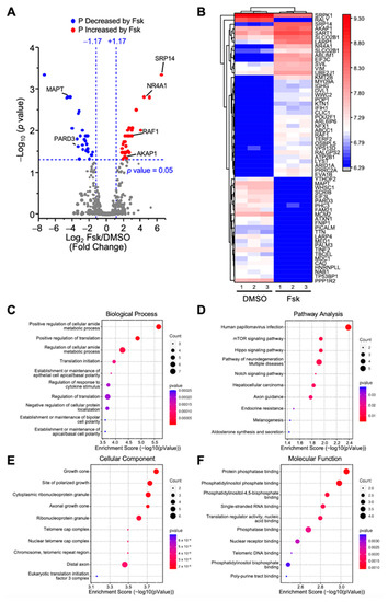 Analysis of differentially phosphorylated proteins in MA-10 Leydig cells in response Forskolin. LC-MS/MS was performed on enriched phosphopeptides extracted and digested from MA-10 Leydig cells treated with either DMSO (control) or Forskolin (Fsk, 10 µm) for 1 h. Phosphorylated proteins were then quantified and compared between treatments. Results are the mean of three individual experiments, each performed in triplicate. (A) Volcano plot comparing the level of phosphorylated proteins detected by LC-MS/MS in control and Fsk-treated MA-10 Leydig cells. Each dot represents a distinct phosphoprotein. A Log2 fold change of +/−1.17 (corresponds to 2.25-fold) with a p-value of 0.05 was used and is represented by the blue dotted lines. In response to Fsk, blue dots depict a decrease in phosphorylation level (two proteins are identified in that group: MAPT and PARD3), while red dots correspond to an increase in phosphorylation level (four proteins are identified in that group: SRP14, NR4A1, RAF1, AKAP1). Grey dots correspond to proteins with no significant changes in phosphorylation levels. (B) Heatmap of protein phosphorylation levels for differentially phosphorylated proteins between treatment groups (control DMSO vs. Fsk). The name of the protein is indicated. The scale on the right represents expression levels (Log10). Biological Process (C), Pathway Analysis (D), Cellular Component (E), and Molecular Function (F) of the differentially phosphorylated proteins are shown.