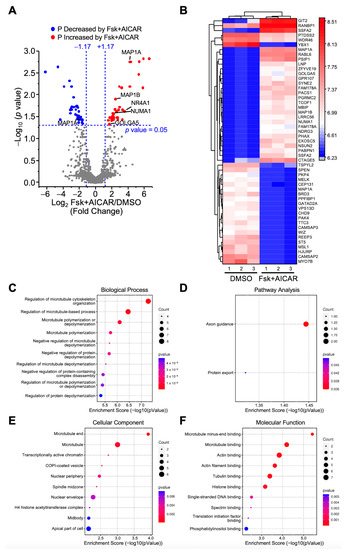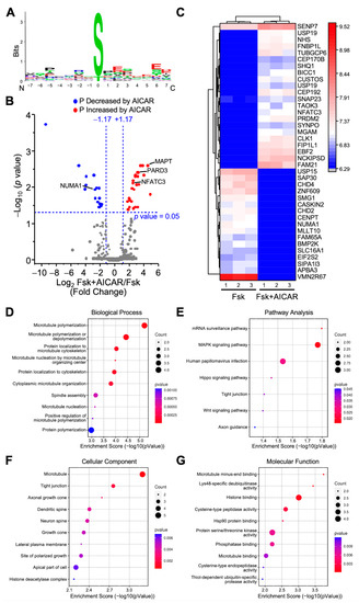 The proteins with increased phosphorylation in the AICAR group included NFATC3 (transcription factor), PARD3, and MAPT; an example of a protein with reduced phosphorylation in the AICAR group is the nuclear mitotic apparatus protein NUMA1 (Figure 3A,B). The proteins differentially phosphorylated between the Fsk+AICAR and Fsk groups are mostly implicated in the microtubule polymerization or its organization (Figure 3D). This is supported by the localization of these proteins, mostly with microtubules (Figure 3F), with their main molecular functions being microtubule binding, histone binding, and deubiquitinase activity (Figure 3G). The pathway analysis revealed that the 44 proteins are mainly associated with the MAPK signaling pathway and mRNA surveillance pathway (Figure 3E).