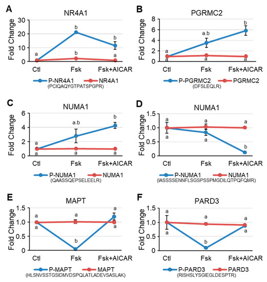 Representative proteins that are differentially phosphorylated in MA-10 Leydig cells in response to Forskolin and to Forskolin+AICAR. Intensity plots of representative phosphoproteins (blue lines) and total proteins (red lines). Ctl, DMSO-treated cells; Fsk, Forskolin-treated cells; Fsk+AICAR, cells treated with Forskolin and AICAR. Results are shown as Fold Change compared to the control. Results are the mean of three individual experiments +/−SEM. The phosphopeptide sequence is shown beneath the graph. For a given protein, different letters indicate a statistically significant difference between treatment groups (p < 0.05).