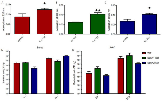 Determination of the VEC barrier stability using Evans blue injection before (control) and 6 h post infection in (A) wt, (B) SphK1−/− and (C) SphK2−/− mice. Bacterial load in (D) blood and (E) liver 6 h and 24 h post infection in wt, SphK1−/− and SphK2−/− mice. Significances were calculated (A–C) between control and infected mice or (D,E) wt and SphK deficient mice using the two-tailed unpaired Student’s t-test, n ≥ 3, * p < 0.05, ** p < 0.01.