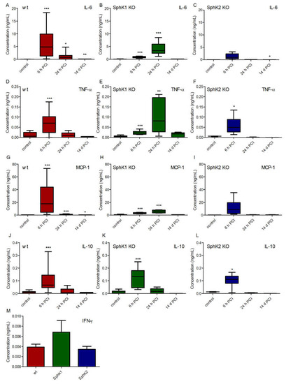 Concentration of (A–C) IL-6, (D–F) IL-10, (G–I) TNF-α and (J–L) MCP-1 in (A,D,G,J) wt, (B,E,H,K) SphK1−/− and (C,F,I,L) SphK2−/− mice before (control) and 6 h, 24 h and 14 d post infection. (M) Concentration of IFN-γ in wt, SphK1−/− and SphK2−/− mice 6 h post infection. Significances were calculated between control and infected mice using the two-tailed unpaired Student’s t-test, n = 3–21, depending on the number of surviving mice at each time point, * p < 0.05, ** p < 0.01, *** p < 0.001.