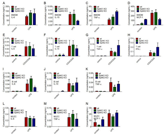 Concentration of (A,E,I,L) IL-6, (B,F,J) IL-10, (C,G,K,M) TNF-α, (D,N) MCP-1 and (H) IFN-γ in (A–D) BMDM, (E–H) T cells, (I–K) B cells and (L–N) MLEC unstimulated (control) and 24 h after stimulation with 10 μg/mL LPS or α-CD3 and α-CD28 antibodies. Significances were calculated between cells derived from wt mice and those derived from SphK1/2 deficient mice in the respective control or LPS-treated groups using two-way ANOVA with Bonferroni posttests, n ≥ 3, * p < 0.05, ** p < 0.01.