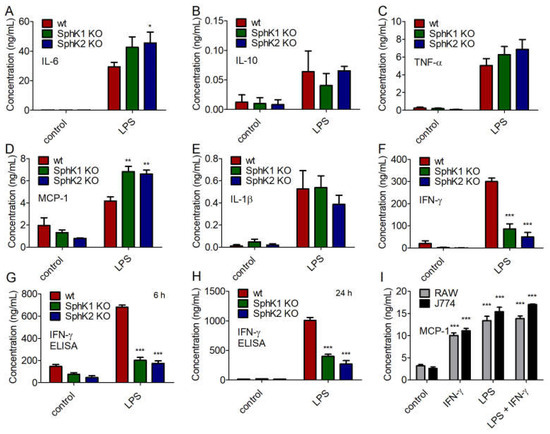 Concentration of (A) IL-6, (B) IL-10, (C) TNF-α, (D) MCP-1, (E) IL-1β, and (F) IFN-γ in BMDC derived from wt, SphK1−/− and SphK2−/− mice unstimulated (control) and 24 h after stimulation with 10 μg/mL LPS, determined by cytometric bead array (CBA, BD Biosciences). Reduced levels of IFN-γ in BMDC derived from SphK1−/− and SphK2−/− mice compared to wt mice as shown in (F) were confirmed by ELISA (G) 6 h and (H) 24 h after stimulation with 10 μg/mL LPS. Significances were calculated between cells derived from wt mice and those derived from SphK1/2 deficient mice in the respective control or LPS-treated groups using two-way ANOVA with Bonferroni posttest, n ≥ 3, * p < 0.05, ** p < 0.01, *** p < 0.001. (I) Concentration of MCP-1 in RAW264.7 and J774.1 murine macrophage cell line supernatant after overnight stimulation with 10 ng/mL IFN-γ and/or 100 ng/mL LPS. Significances were calculated between control and stimulated cells using the two-tailed unpaired Student’s t-test, n = 4.
