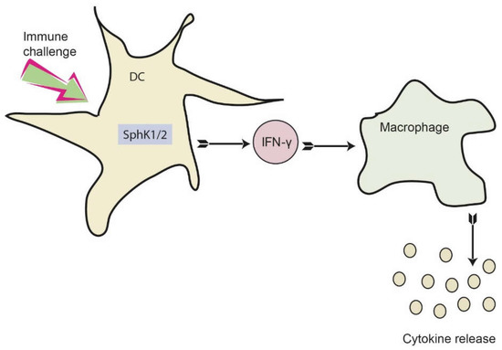 Proposed role of SphKs in DC for dampening the early cytokine response after systemic infection. Activation of SphK1/2 in DC results in increased IFN-γ release, which consequently activates macrophages. As a result, macrophages produce and secrete a number of additional pro-inflammatory cytokines. This eventually results in a dysregulated immune response, which may be prevented by inhibition of SphK1/2 in DC.