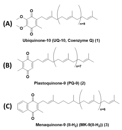 Structures of representative lipoquinones from each subclass. (A) Ubiquinone-10, also known as Coenzyme Q10 or UQ-10. (B) Plastoquinone-9 (PQ-9). (C) Menaquinone-9(II-H2) (MK-9(II-H2)).