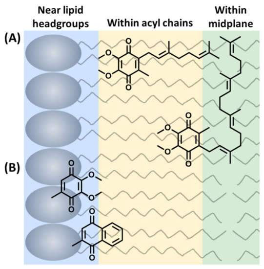 Three possible locations of the lipoquinone headgroup: (A) Example of the influence of sidechain on the location of the headgroup. UQ-2 and UQ-4 are both shown as illustrative examples within the acyl chains or within the midplane. (B) Example of the influence of headgroup polarity on the location of the quinone headgroup in the membrane (sidechains omitted for clarity). This figure was originally published in Ref. [41] to include UQ-derivatives in (A). It is licensed under CC-BY 4.0.