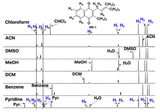 Recently, truncated lipoquinones have been used to overcome solubility issues. These derivatives contain the same headgroups as the long-chain counterparts but with shorter sidechains (1–4 isoprene units). For example, MK-2 and UQ-2 have been used as truncated representatives of MK-9 and UQ-10, respectively. Although these short-chain derivatives are still hydrophobic, they are more soluble in organic and aqueous solutions making them attractive alternatives for analysis in aqueous assays. The truncated lipoquinone derivatives are small enough to fit within a typical phospholipid bilayer. One of the first examples of using truncated lipoquinones occurred when Kishi and coworkers measured the reduction potentials of truncated lipoquinone and lipoquinol derivatives in dimethylformamide and calculated their potentials in water [70]. In our recent study, we synthesized MK-1 and MK-1(H2) for conformational analysis using 1D and 2D NMR techniques (See Section 2.4 for additional details) [71]. Therein we observed the chemical shifts of the aromatic protons shifted slightly between polar and non-polar solvents. As shown in Figure 4, the aromatic protons Ha/Hb and Hc/Hd shift closer together in polar solvents and spread further apart in nonpolar solvents. Similar studies were reported using MK-2 [60] and UQ-2 [41]. This was supported further through 2D Nuclear Overhauser Effect (NOESY) and Rotating-frame Nuclear Overhauser Effect (ROESY) NMR studies (See Section 2.4.1 and Section 2.4.3) Through the use the truncated derivatives, we were able to investigate the conformations of the lipoquinones not only in organic solvents but also in a model membrane system. Similar studies would not have been possible if the long chain derivatives were used for the NMR study; both because of the complications relating to the assignment of protons on the long sidechain and the fact that the model membrane system has a monolayer and the MKs with longer sidechains would span and then extend past the monolayer of the reverse micellar model system.