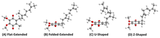 Four different possible conformations, using UQ-2 as an example, describing the relationship between the headgroup and the end of sidechain observed in computational studies. (A) Flat-extended conformation, (B) Folded-Extended, (C) U-Shaped. These images were reported in our recent paper regarding the conformations of UQ-2 [41] and licensed under CC BY 4.0. Here we also include an additional conformation (D) Z-shaped, generated using calculations in Chem3D.