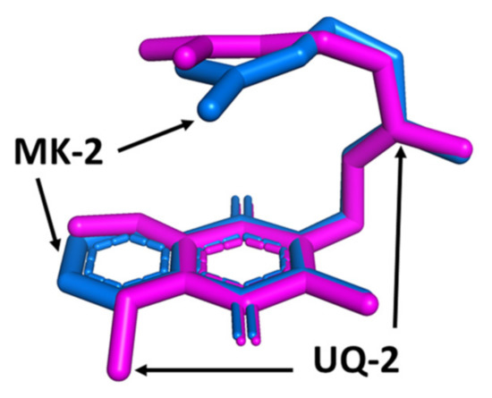 Superimposed 3D conformations of UQ-2 (pink) and MK-2 (blue) based on the 2D NMR data in DMSO. This figure was originally published in Ref. [41] and is licensed under CC-BY 4.0. The original figure was modified to include only the depicted image.