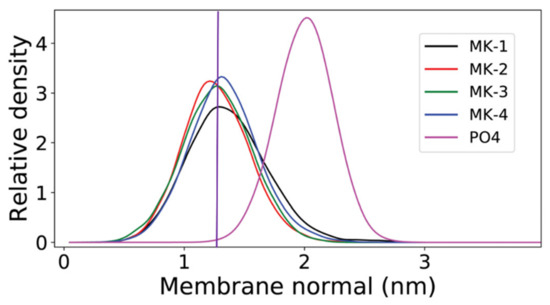 The location of MK-1 through MK-4 was determined using Langmuir monolayer studies and in computational study performed by our collaborators, Arantes and coworkers. Using dipalmitoylphosphatidycholine (DPPC) and dipalmitoylphosphorylethanolamine (DPPE) phospholipids, all the truncated MK-derivatives were found to migrate from the air-water interface into the acyl tails at physiological surface pressure, showing the MK-derivatives do associate, but do not disrupt, the phospholipid packing [1]. This contrasts with the results found for UQ-derivatives in a similar experimental study [114,115,116]. In the accompanying computational study, Arantes and coworkers used palmitoyloleoylphosphatidylcholine (POPC) model membrane to determine the location of MK-1 through MK-4. They found that all four headgroups were localized near the polar lipid headgroups of POPC with only slight variations in position as highlighted in Figure 11 [1].