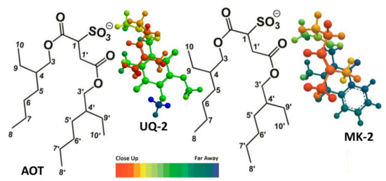 The conformation of MK-2 in AOT RMs was similarly determined by the cross peaks between the headgroup and the terminal methyl protons suggest that the end of the sidechain is positioned over the headgroup, overall suggesting MK-2 adopts a folded, U-shaped conformation in AOT RMs. The conformations of MK-1 and MK-1(H2) were also investigated using analogous NMR studies [71]. Both derivatives were found to adopt folded-extended conformations in organic solvents and AOT RMs. This designation was attributed to the shorter sidechain that is not long enough to extend over the headgroup to achieve a U-shaped conformation.