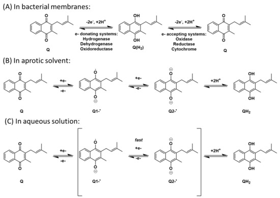 While the function of menaquinone derivatives is well established, the role of regiospecific partial saturation in the isoprenyl sidechain on menaquinone’s redox potential remains unclear. The effects of structural differences on the redox potentials and diffusion coefficients of various MK-derivatives in three aprotic solvents (MeCN, DMSO, and pyridine) has been reported in a Ph.D. dissertation by Cheryle Beuning at Colorado State University [79]. This Ph.D. dissertation investigates the partially saturated MK-2(II-H2) and MK-3(II-H2) derivatives, and these were found to be easier to reduce (more positive potentials), than the fully unsaturated and the fully saturated MK-derivatives, the latter being among the hardest MK-derivatives to reduce (more negative potentials). Most unsaturated MK-derivatives were in the mid-range of potentials measured. These results are in line with the interpretation that the composition of the sidechain plays a role in the reduction potential of the compound. In addition, there are examples of stable semiquinone species having biological activity with receptor sites in QH2-reductases; however, the most common reduced form in biological systems is the quinol [81,82,83]. Undoubtedly, these patterns provide insight into these interesting molecules.