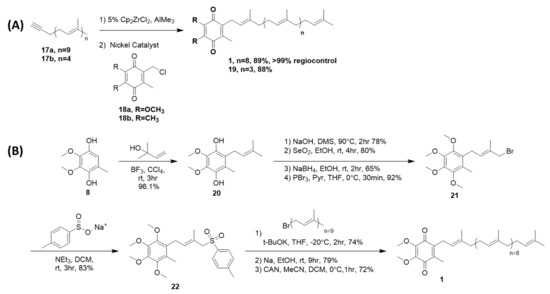 - Lipshutz, B.; Lower, A.; Berl, V.; Schein, K.; Wetterich, F. An improved synthesis of the “Miracle Nutrient” Coenzyme Q10. Org. Lett. 2005, 7, 4095–4097. [Google Scholar] [CrossRef] [PubMed]