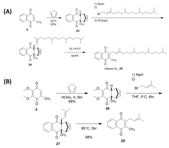 - Maruyama, K.; Naruta, Y. Synthesis of naturally occurring quinones. Part 3. Allylation of quinones with allyltin reagents. New synthesis of coenzyme Q1 and plastoquinone-1. J. Org. Chem. 1978, 43, 3796–3798. [Google Scholar] [CrossRef]