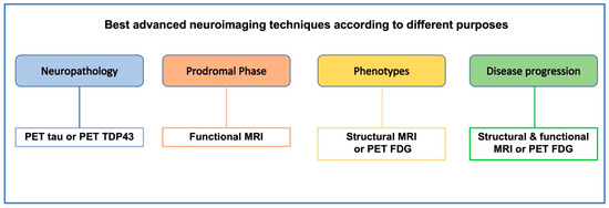 In the last few years, advanced neuroimaging techniques have gone beyond the mere neuroanatomical description of frontotemporal atrophy or hypometabolism in FTD patients, and have helped in increasing the diagnostic accuracy, in disentangling the features associated with monogenic disease, in describing the earliest changes occurring in the prodromal phases, and in forecasting disease progression [10]. Moreover, new positron emission tomography tracers provide key information to define the underlying neuropathology [11,12,13,14,15]. These neuroimaging developments have contributed to the exploration of FTD pathogenesis and to the identification of novel potential biomarkers. Since at present there is a lack of disease-modifying therapies in FTD and treatment relies on symptomatic interventions [16], brain imaging biomarkers might be crucial in facilitating the recruitment of patients in clinical trials.