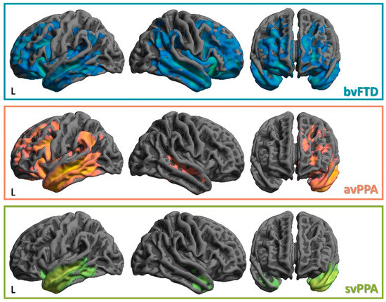 Representative VBM analysis in FTLD. From our historical cohort of FTLD patients we performed a structural MRI analysis (voxel-based morphometry) to demonstrate the different patterns of gray matter atrophy. To this aim, we considered the following cohort of subjects (80 healthy controls (63.1 ± 7.9 years, 75% females); 122 bvFTD (64.8 ± 7.9 years, 38% females): 68 avPPA (65.6 ± 8.4 years, 66.2% females); 30 svPPA (63.6 ± 8.4 years, 56.7% females). Age and gender are considered nuisance variables in the statistical model. The findings (patient < healthy controls for each group) are superimposed on a 3D MRI template; clusters surviving a statistical threshold of p < 0.05 FWE whole-brain correction for multiple comparisons are reported. VBM—voxel-based morphometry; MRI—magnetic resonance imaging; FWE—family-wise error; L—left.