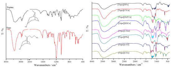 Tropine, Trps and eight target ionic liquids were verified via infrared spectra in Figure 4. Detailed infrared analysis of tropine, Trps and [Trps][OTs] were shown in Table S2. The difference among the eight ionic liquid IR spectra was mainly embodied in anion absorption peak.