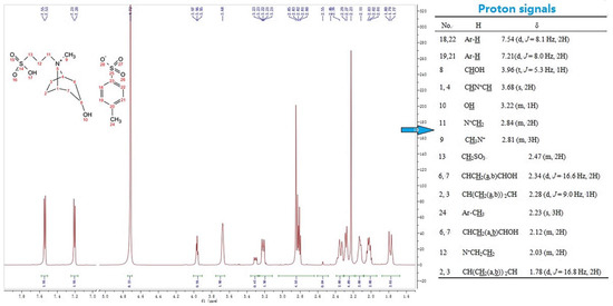 The 1H NMR spectra of [Trps][OTs] is shown in Figure 5, and the detailed hydrogen spectrum data of the eight types of ionic liquids synthesized are shown in Table S3 (see SM). When the anion was changed, the chemical shift of H atoms (H-1–9) in cation varied in the range of 0.1–0.2 ppm, and the main contribution for the spectral difference results from the proton signals (protons on acid group and benzene ring) of anions. Taking the data of [Trps][OTs] as an example for analysis, H-8 directly connected to O can be found in the lower-field regime (3.96, 1H); the quaternarized N atom carries a positive charge to produce a deshielding effect on surrounding H atoms in a manner. The hydrogen spectrum of [Trps][OTs] shows two groups of characteristic H signals at the ortho (7.54, 2H) and meta (7.21, 2H) positions of the sulfonic acid group on the aromatic ring in the anion; additionally, there was a CH3 peak on the aromatic ring at 2.23 ppm. Introducing of anions made resonance signals of cation protons generally move toward a higher field by comparison with those of Trps.