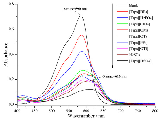 Crystal violet was selected as the indicator, and the spectrum scan graph for measured ionic liquid and vitriol with equal molar concentration was shown in Figure 6. The weakening degree of maximal absorbance of 0.01 g L−1 crystal violet was varying due to different binding capacities of different ionic liquids with indicator. When hydrogen sulfate was the anion, the maximal absorbance of indicator reduces by 83.05%, and Hammett value was 0.1098 under a concentration of 25 mmol L−1, which shows the strongest acidity.