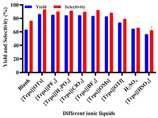 Basically, the conversion increased with higher acidity of FILs and is coupled with increase of side reaction, which would decrease the selectivity of reaction and the yield of target product. Some other factors will also affect the reaction results, such as ionic liquid viscosity and ionic liquid dissolving ability for reactants; so, acidity is analyzed as the main reason here. Here, the ionic liquid viscosity was measured using an NDJ-1 type viscosity meter (DECCA Inc., Shanghai, China) at room temperature, which shows the results of 243 cP ([Trps][BF4]), 323 cP ([Trps][H2PO4]), 264 cp ([Trps][ClO4]), 277 cP ([Trps][OMs]), 201 cp ([Trps][OTs]), 309 cP ([Trps][PF6]), 342 cP ([Trps][OTf]) and 396 cP ([Trps][HSO4]). In a homogeneous system under heating conditions, the collision probability of substrate and acylating reagent molecule could increase, so the conversions for blank reaction and for H2SO4-catalyzed reaction could achieve 62% and 73%. However, their reaction yield and selectivity were apparently lower compared with ones catalyzed with even weak acidity of ionic liquid. Comprehensively considering product yield, reaction selectivity and ionic liquid preparation, [Trps][OTs] is suggested as the optimum catalyst for aspirin reaction. Generally, the cations of acidic ILs play an important role in their selectivity and solubility, while the anions reflecting the difference among IL acidity have an obvious impact on the yield when the ILs have the same cation, so the catalytic performance is often the result of the coordination of anions and cations. It should also be worth mentioning that no extra solvent and catalyst is needed in the esterification of this study, and the selected IL can play the dual roles of solvent and catalyst. Differently, cyclohexane (co-solvent) or HCl (co-catalyst) were necessary in the reported processes catalyzed by acidic ILs or silica-immobilized acidic ILs before [35,36].