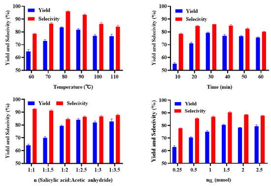 The effects of reaction time, ratio of salicylic acid to acetic anhydride and amount of ILs were investigated at 80 °C. The conversion of substrate and yield of target product or reaction selectivity increase with longer reaction time, higher ratio and larger amount, but the yield or selectivity trended to a peak at a certain point. In comparison, the reaction speed catalyzed by this applied acidic IL is obviously faster than 1-methylimidazolium tetrafluoroborate (2~10 h) [37], and its consumption is much lower than that in previous study [38].