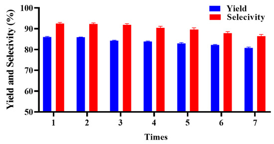 The results of the recovery test are shown in Figure 9. The conversion of substrate, product yield and reaction selectivity fluctuated around the initial catalyzing effect or appeared to slightly drop. For instance, the reaction yield after the fifth recovering was kept to 81.1%, which is very close to the first yield of 88.7%. Once the yield and selectivity drop to an unacceptable level for users, a more efficient resin purification method is recommended instead of the simple washing method [38,39].