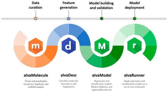 In this work, we presented a software suite capable of handling the needs of a QSAR workflow. We demonstrated the ability of each software tool by applying them to a binary classification QSAR problem according to the OECD principles. We started from the data curation with alvaMolecule. The feature generation was taken care of by calculating fingerprints and descriptors with alvaDesc. Then, we developed four models to predict the ability of molecules to pass the blood–brain barrier by using alvaModel. The models have been validated with well-known metrics, cross-validation and on an external test set. Finally, we bundled these models into a project which can be opened in alvaRunner to allow the prediction of the BBB permeability on new molecules without any extra software tool. The prediction is also equipped, for each of the models, with an applicability domain. The alvaRunner project is available at https://www.alvascience.com/model-blood-brain-barrier-bbb-permeability/ (accessed on 16 October 2022).