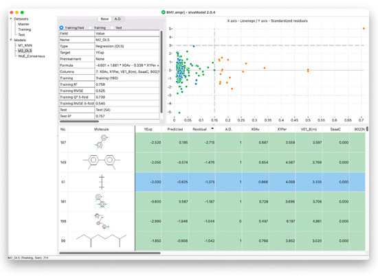 The third OECD principle states the importance of calculating an applicability domain which represents the theoretical region of the chemical space where a model can generate reliable predictions [28,29,30]. This can be completed in alvaModel, for example, by calculating distance-based applicability domains which measure the distance between a sample molecule and the model training set and determines if the sample is inside the applicability domain based on a threshold. Another technique, known as leverage applicability domain, estimates the distance from the model’s experimental space using the leverage matrix, which is also used in the Williams plot (Figure 4). In fact, the Williams plot can be useful for graphically detecting outliers that are outside the leverage applicability domain [12].