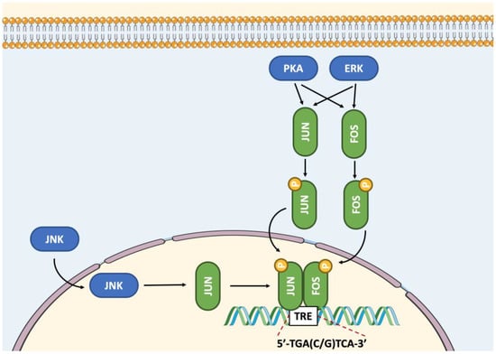 There are several ways to activate and/or increase the expression of AP-1 factors. In fact, numerous signaling pathways leading to the phosphorylation of serine and threonine residues participate in the regulation of their expression and activity [39,40]. The Jun promoter is primarily activated by the recruitment of JUN/ATF2 heterodimer to a major Jun/TRE cis regulatory element [41]. Three regulatory elements—the sis-inducible enhancer (SIE), the serum response element (SRE), and the CRE—can activate the Fos promoter in response to a variety of hormones, growth factors, and cytokines [33,42,43,44,45,46]. Indeed, the expression of Fos will be enhanced following the recruitment of ATF or CREB factors to a CRE element in response to increased levels of second messengers cAMP and calcium [8,44]. The SRE regulatory element can be bound by a dimer consisting of the serum response factor (SRF) and ETS Like-1 (ELK1) being activated by exposure to UV light or growth factors, leading to increased Fos expression [46,47]. The SIE regulatory element allows the recruitment of dimers of the signal transducer and activator of transcription (STAT) family, in particular STAT1 and STAT3, to activate Fos gene expression [45,48]. These STAT members are mainly activated by the Janus kinase (JAK) pathway [49]. In most cell types, the SRE and CRE in the Fos and AP-1 (TRE) element in the Jun promoters are involved in basal expression of these genes [50,51,52]. Moreover, Jun is autoregulated by its own expression with the JUN/ATF2 heterodimer [41,51]. Similarly, the Fos gene can also self-regulate after its activation [53]. Hence, AP-1 members can regulate each other to fine-tune their expression [54].