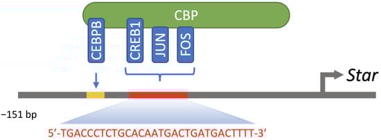 Overview of bZIP transcription factors recruited to the proximal region of the Star promoter. CEBPB is recruited to its regulatory element between −117 and −108 bp (5′-ATGAGGCAAT-3′), whereas CREB1, JUN and FOS form homo- or heterodimer competing for binding to the −96 to −67 bp region.