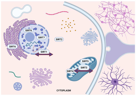 Differential localization of sirtuins (SIRT1-7) in neuronal cells. SIRT1 is mainly located in the nucleus of normal cells, whereas SIRT2 is mainly cytoplasmic. SIRT3, SIRT4, and SIRT5 are mitochondrial proteins; however, SIRT3 may also be found in the nucleus and cytosol under different cellular events. SIRT6 is a nuclear protein but can also be detected in the endoplasmic reticulum, where it inactivates NF-κΒ. SIRT7 is mainly localized in the nucleolus. (Created with BioRender.com, accessed on 17 July 2022).