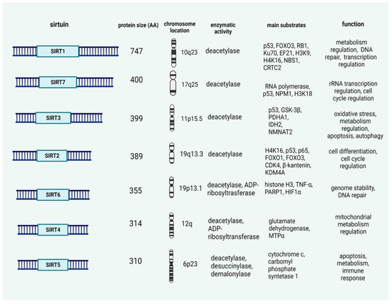 Sirtuins’ structural and functional characteristics. (Created with BioRender.com, accessed on 18 September 2022).