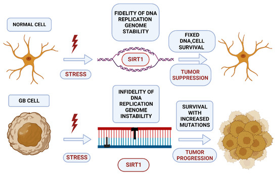 The dual role of the sirtuin SIRT1 in the GB cell. In a normal cell, stress activates SIRT1, which induces epigenetic silencing of the damaged DNA site, modulates DDR (DNA damage response), and DNA repair proteins, resulting in DNA replication fidelity and cell survival. In cancer cells and upon persistent stress signals, SIRT1 is upregulated and promotes further DNA repair with additional DNA mutations, increasing genomic instability and leading to tumor progression. (Created with BioRender.com, accessed on 17 July 2022).
