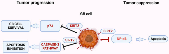 The role of the sirtuin SIRT2 in glioblastoma (GB). (Created with BioRender.com, accessed on 17 July 2022).