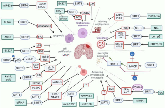 Overview of sirtuins-associated signaling pathways implicated in glioblastoma development and progression. Red rectangle: signaling pathways; blue oval: sirtuin member; blue rectangle: sirtuin targeting agent or approach. (Created with BioRender.com, accessed on 16 October 2022).