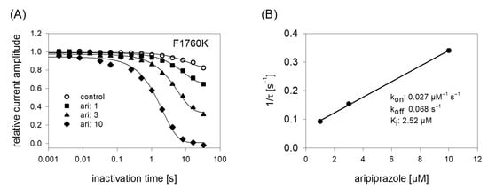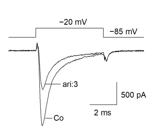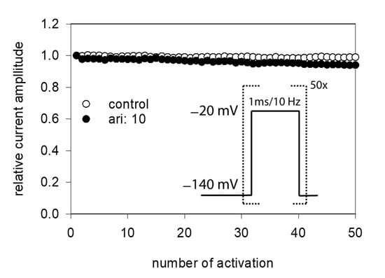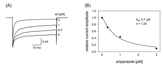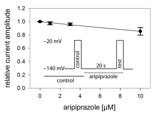 - Park, J.; Cho, K.-H.; Lee, H.J.; Choi, J.-S.; Rhie, D.-J. Open channel block of Kv1.4 potassium channels by aripiprazole. Korean J. Physiol. Pharmacol. 2020, 24, 545–553. [Google Scholar] [CrossRef] [PubMed]