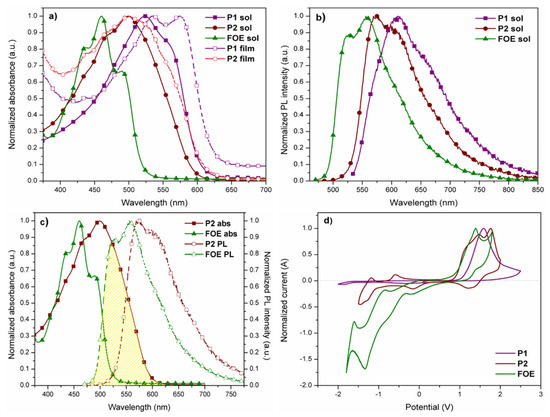 | Sample | TDT10% (°C) 1 | λmaxsol (nm) 2 | λmaxfilm (nm) 2 | λmaxem (nm) 3 | Sol (eV) 4 | Film (eV) 4 | EHOMO (eV) 5 | ELUMO (eV) 5 |