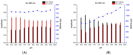 Relative contributions (relative amplitude, left vertical axis) and lifetimes (the value of the short-lived component is shown as blue squares, right vertical axis) of both components based on the biexponential fit of the fluorescence decay data of EGFP-Y145L/S205V upon excitation with (A) a 490 nm, single-photon laser source and (B) a 450 nm, single-photon laser source at different pH levels varying from pH = 5.5 to pH = 10.0. The black columns denote the contribution of the short-lived component, and the red columns denote the long-lived component. The blue squares and the solid line (right axis) show the lifetime of the short-lived component.