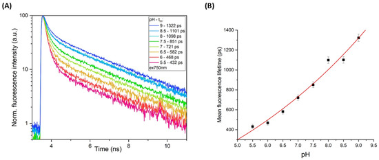The pH-dependent photobehavior of EGFP-Y145L/S205V recorded by time-resolved fluorescence spectroscopy upon two-photon 750 nm excitation. (A) Normalized fluorescence decay kinetics at different pH levels, varying from pH = 5.5 to pH = 9.0. The mean lifetime values and the color legend are in the inset in the top right area. (B) The graph describing the dependence of the mean lifetime on the pH.