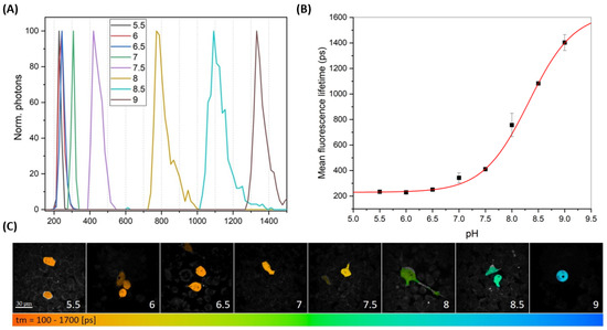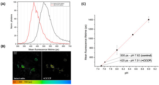 The FLIM visualization of the CCCP-stimulated live HEK293T cells displayed the mean lifetime shortening (to ~425 ps, Figure 4) of the indicator, which can be quantified as a decrease in the pH value to ~7.51 (Figure 4C). Importantly, the lifetime distribution histogram (Figure 4A) displayed clearly resolved signal peaks for the measurements of the intact and CCCP-stimulated cells, thus indicating the reliability of the pH value determination.
