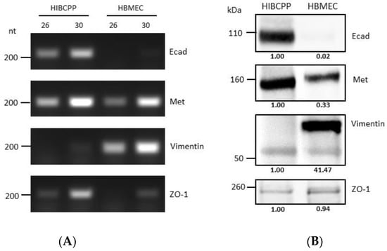 It has previously been shown that HIBCPP cells express Met and E-cadherin (Ecad) [10], and there is evidence that HBMEC express Met and vimentin [25,26]. Analysis via semiquantitative RT-PCR and western blotting (Figure 1) confirmed and demonstrated that while HIBCPP cells express E-cadherin (a marker of epithelial cells), they do not express vimentin (a marker of mesenchymal cells). On the other hand, HBMEC do not express E-cadherin, but do express vimentin (due to being cells of mesenchymal origin). Both cell lines express Met (which is normally expressed in both endothelial and epithelial cells), and both of them express ZO-1 (a tight junction marker protein), although the level of transcription and expression of the two is somewhat different between the two cell lines (Figure 1).