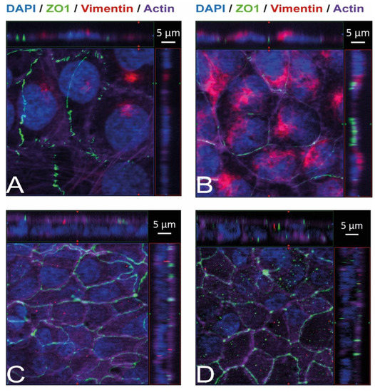 Vimentin, both intracellularly and on the cellular surface, is present in HBMEC but absent in HIBCPP cells. Immunofluorescence staining was performed with HBMEC (A,B) and HIBCPP cells (C,D). Vimentin staining is shown in red, the phalloidin-stained actin cytoskeleton is shown in purple, tight junctions are visualized via the staining of ZO1 (green), and nuclei are stained with DAPI (blue). The center part of each image displays an xy enface view presented as a maximum intensity through the z-axis of selected slices. The top and right-side parts of each panel are cross sections through the z-plane of multiple optical slices. The apical sides of HBMEC and HIBCPP cells are oriented toward the top of the top part and towards the right of the right part of each panel, respectively. Samples presented on the left (A,C) were not permeabilized before the binding of the anti-vimentin antibody and, therefore, show only vimentin present on the surface of the cells. Samples presented on the right (B,D) were permeabilized before the binding of the anti-vimentin antibody and, therefore, show the total vimentin present in the cells.