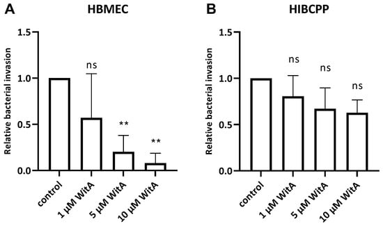 The results obtained during the infection experiments show a statistically significant WitA-concentration-dependent decrease in invaded Lm in HBMEC (Figure 5A). In contrast, treatment of HIBCPP cells with WitA resulted in no statistically significant decrease in invasion with all WitA concentrations applied (Figure 5B). Analysis via live/dead assay showed that co-incubation with WitA in presence of Lm does not affect the survival of HBMEC or HIBCPP cells (Supplementary Figure S2).