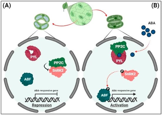 Signaling pathway for the expression of abscisic acid (ABA)-responsive genes. (A) Repression of ABA-responsive genes. In the absence of ABA, clade A protein phosphatases (PP2Cs) physically interact with sucrose non-fermenting 1-related protein kinase 2s (SnRK2s) to reduce kinase activity via dephosphorylation. This results in the inhibition of ABRE-binding (AREB)/ABRE-binding factors (ABFs) and the suppression of ABA-responsive gene transcription. (B) The activation of ABA-responsive gene expression. Under drought stress, soluble ABA receptors (Pyrabactin resistance/PYR-related/regulatory component of the ABA receptors [PYR/PYL/RCARs]) and PP2Cs act as co-receptors to capture ABA, thereby blocking the phosphatase activity of PP2Cs. PP2Cs are released from PP2C-SnRK2 complexes, and free SnRK2s phosphorylate downstream transcription factors (AREBs/ABFs). The phosphorylated AREBs/ABFs trigger the transcription of numerous ABA-responsive genes, leading to ABA responses including stomatal closure.