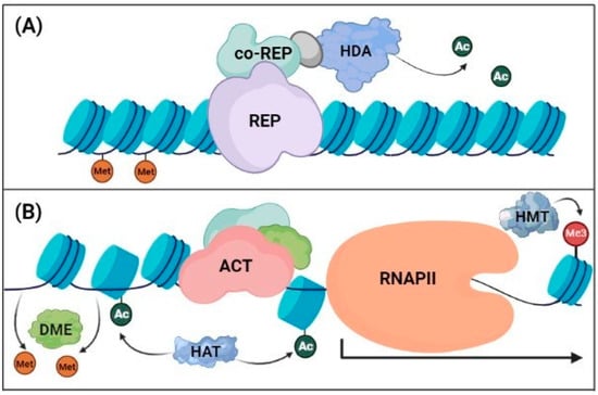 Hypothetical model of chromatin remodeling for the regulation of gene transcription. (A) Repression of gene transcription. Under normal conditions, promoter DNA is methylated, and repressors (REPs) or REP-corepressor (co-REP) complexes recruit histone deacetylases (HDAs) to compact the local chromatin region, leading to gene suppression. (B) Activation of gene transcription. For gene transcription, promoter DNA is demethylated by DNA glycosylase (DME). Repressors are released from the promoter, and activators (ACTs) or activator complexes bind to the open promoter region, which facilitates RNA polymerase II (RNAPII) access to initiate gene transcription. Histones are acetylated by histone acetyltransferases (HATs) to weaken DNA–histone interactions or are methylated by histone methyltransferases (HMTs).